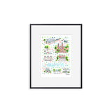 Elevate your wall decor with Evelyn Henson's whimsical watercolor map series, a vibrant collection boasting 250+ places and counting. Each print is a celebration of cherished locations, adorned with unique icons and landmarks that capture the essence of the place. Professionally printed in the USA, these prints mirror the original watercolor's charm, adding a burst of color and joy to your space. Choose a single print to commemorate a beloved locale and relive cherished memories, or create a gallery by displaying multiple prints to weave a visual narrative of your journeys. Transform your walls into a personalized showcase of meaningful places with these professionally crafted watercolor city map prints.