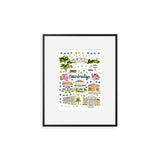 Elevate your wall decor with Evelyn Henson's whimsical watercolor map series, a vibrant collection boasting 250+ places and counting. Each print is a celebration of cherished locations, adorned with unique icons and landmarks that capture the essence of the place. Professionally printed in the USA, these prints mirror the original watercolor's charm, adding a burst of color and joy to your space. Choose a single print to commemorate a beloved locale and relive cherished memories, or create a gallery by displaying multiple prints to weave a visual narrative of your journeys. Transform your walls into a personalized showcase of meaningful places with these professionally crafted watercolor city map prints.