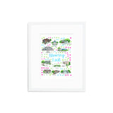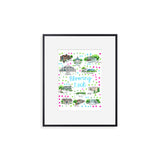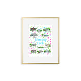 Elevate your wall decor with Evelyn Henson's whimsical watercolor map series, a vibrant collection boasting 250+ places and counting. Each print is a celebration of cherished locations, adorned with unique icons and landmarks that capture the essence of the place. Professionally printed in the USA, these prints mirror the original watercolor's charm, adding a burst of color and joy to your space. Choose a single print to commemorate a beloved locale and relive cherished memories, or create a gallery by displaying multiple prints to weave a visual narrative of your journeys. Transform your walls into a personalized showcase of meaningful places with these professionally crafted watercolor city map prints.