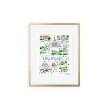 Elevate your wall decor with Evelyn Henson's whimsical watercolor map series, a vibrant collection boasting 250+ places and counting. Each print is a celebration of cherished locations, adorned with unique icons and landmarks that capture the essence of the place. Professionally printed in the USA, these prints mirror the original watercolor's charm, adding a burst of color and joy to your space. Choose a single print to commemorate a beloved locale and relive cherished memories, or create a gallery by displaying multiple prints to weave a visual narrative of your journeys. Transform your walls into a personalized showcase of meaningful places with these professionally crafted watercolor city map prints.