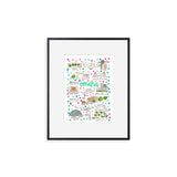 Elevate your wall decor with Evelyn Henson's whimsical watercolor map series, a vibrant collection boasting 250+ places and counting. Each print is a celebration of cherished locations, adorned with unique icons and landmarks that capture the essence of the place. Professionally printed in the USA, these prints mirror the original watercolor's charm, adding a burst of color and joy to your space. Choose a single print to commemorate a beloved locale and relive cherished memories, or create a gallery by displaying multiple prints to weave a visual narrative of your journeys. Transform your walls into a personalized showcase of meaningful places with these professionally crafted watercolor city map prints.